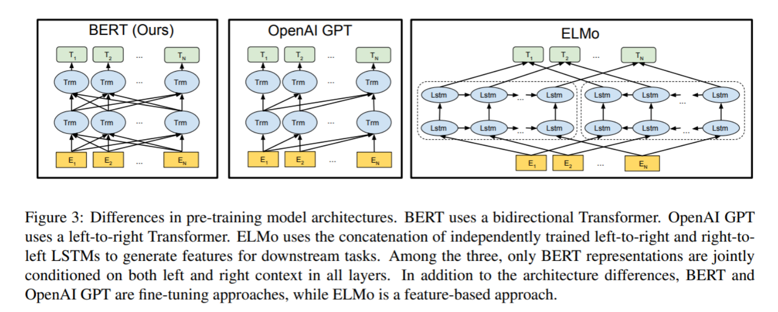 总体架构: 如下图所示, 最左边的就是BERT的架构图, 可以很清楚的看到BERT采用了Transformer Encoder block进行连接, 因为是一个典型的双向编码模型.