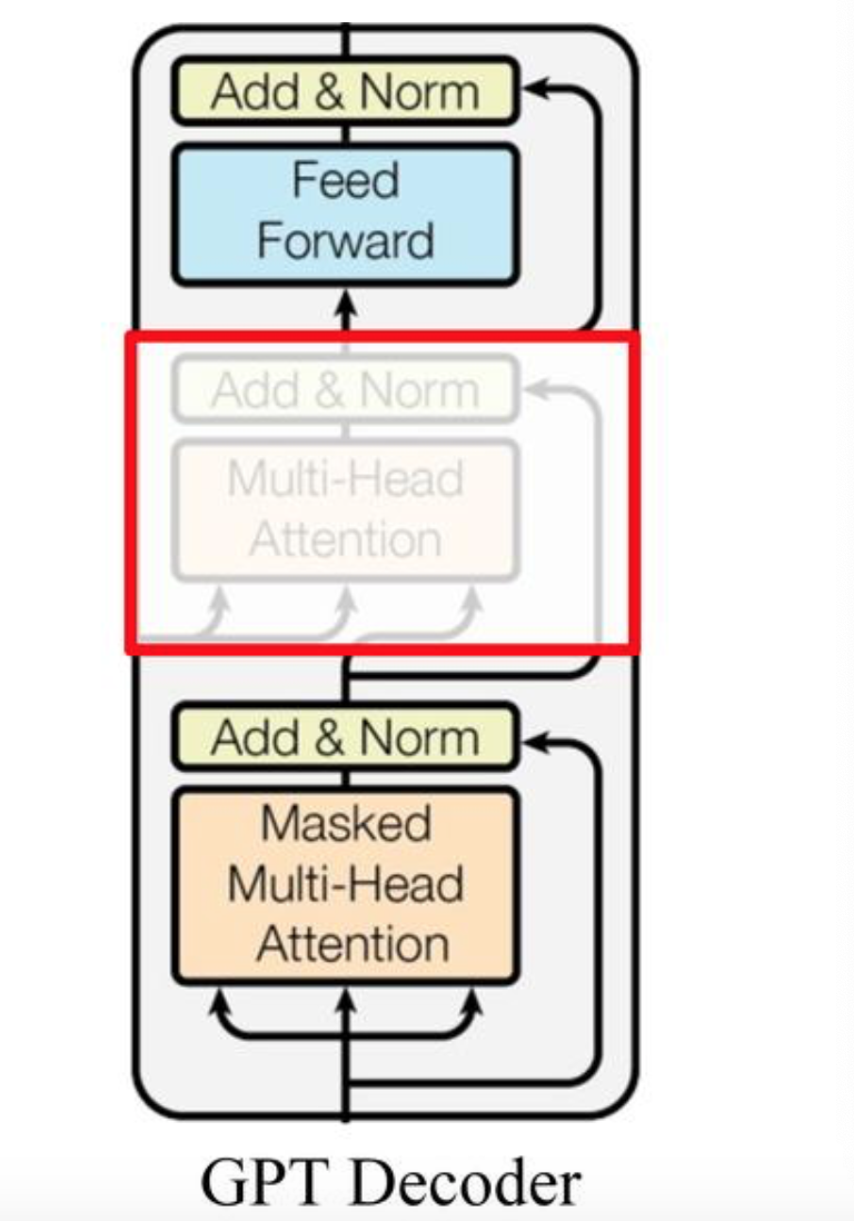 如上图所示, 经典的Transformer Decoder Block包含3个子层, 分别是Masked Multi-Head Attention层, encoder-decoder attention层, 以及Feed Forward层. 但是在GPT中取消了第二个encoder-decoder attention子层, 只保留Masked Multi-Head Attention层, 和Feed Forward层.
