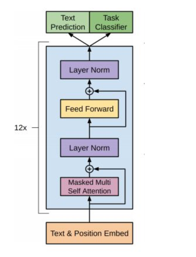作为两大模型的直接对比, BERT采用了Transformer的Encoder模块, 而GPT采用了Transformer的Decoder模块. 并且GPT的Decoder Block和经典Transformer Decoder Block还有所不同, 如下图所示: