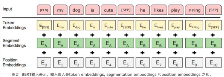 - Token Embeddings 是词嵌入张量, 第一个单词是CLS标志, 可以用于之后的分类任务.