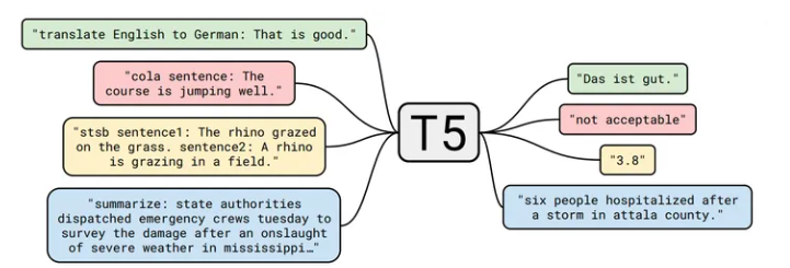 比如英德翻译,只需将训练数据集的输入部分前加上“translate English to German(给我从英语翻译成德语)” 就行。假设需要翻译"That is good",那么先转换成 "translate English to German:That is good." 输入模型,之后就可以直接输出德语翻译 “Das ist gut.”。 对于需要输出连续值的 STS-B(文本语义相似度任务), 也是直接输出文本。
