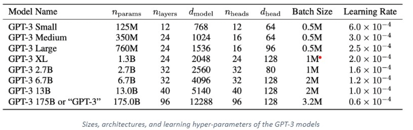 实际上GPT-3 不是一个单一的模型, 而是一个模型系列. 系列中的每个模型都有不同数量的可训练参数. 下表显示了每个模型、体系结构及其对应的参数: