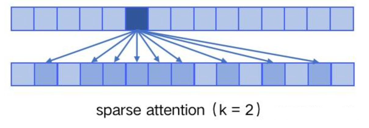 dense attention:每个 token 之间两两计算 attention,复杂度 O(n²) sparse attention:每个 token 只与其他 token 的一个子集计算 attention,复杂度 O(n*logn)