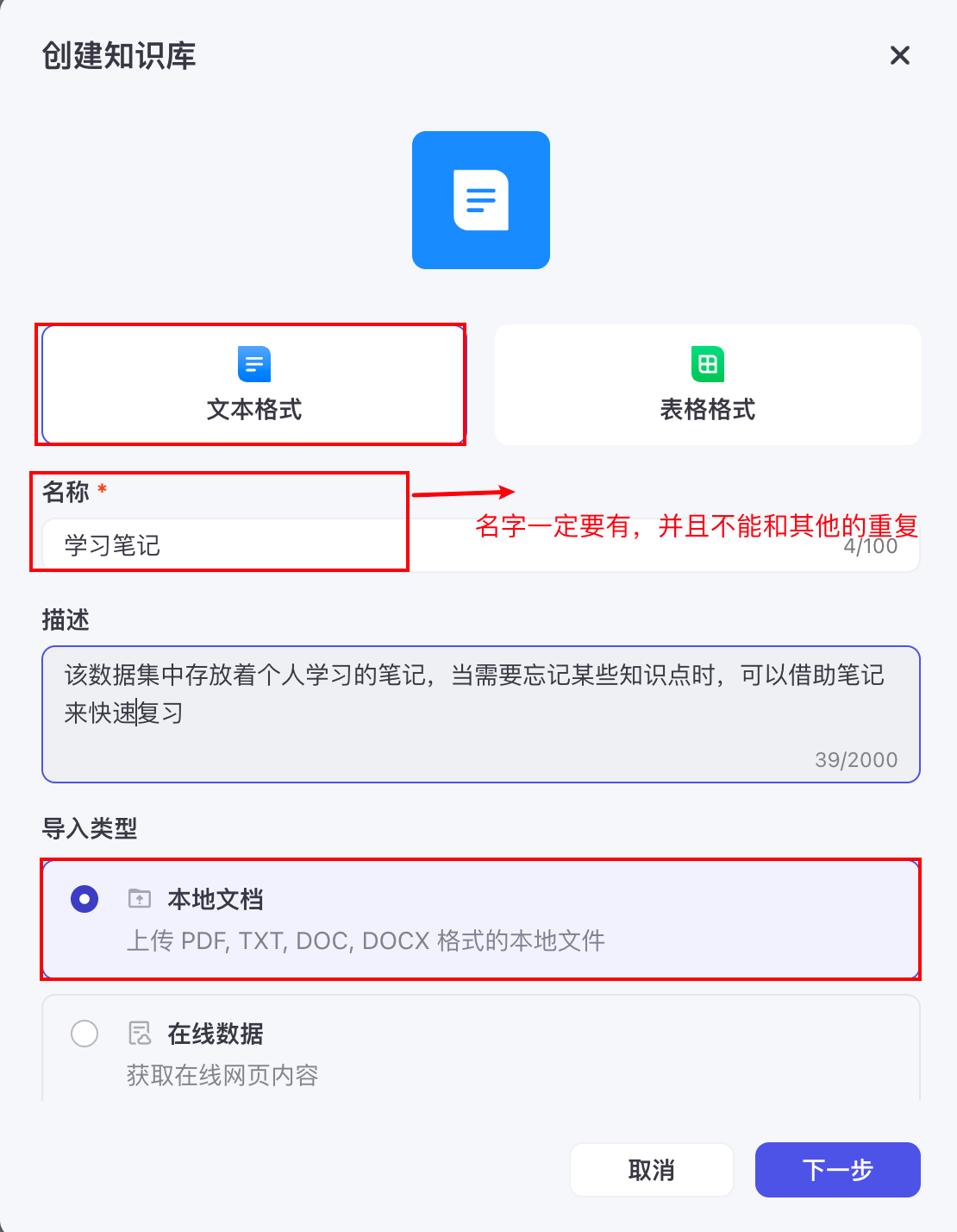 - 在知识库页面,选择**文本格式**,然后单击**本地文档**。单击**下一步**。