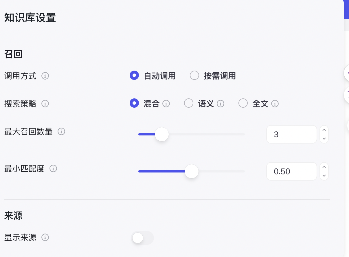 点击知识库配置上的自动调用选项,修改检索策略。