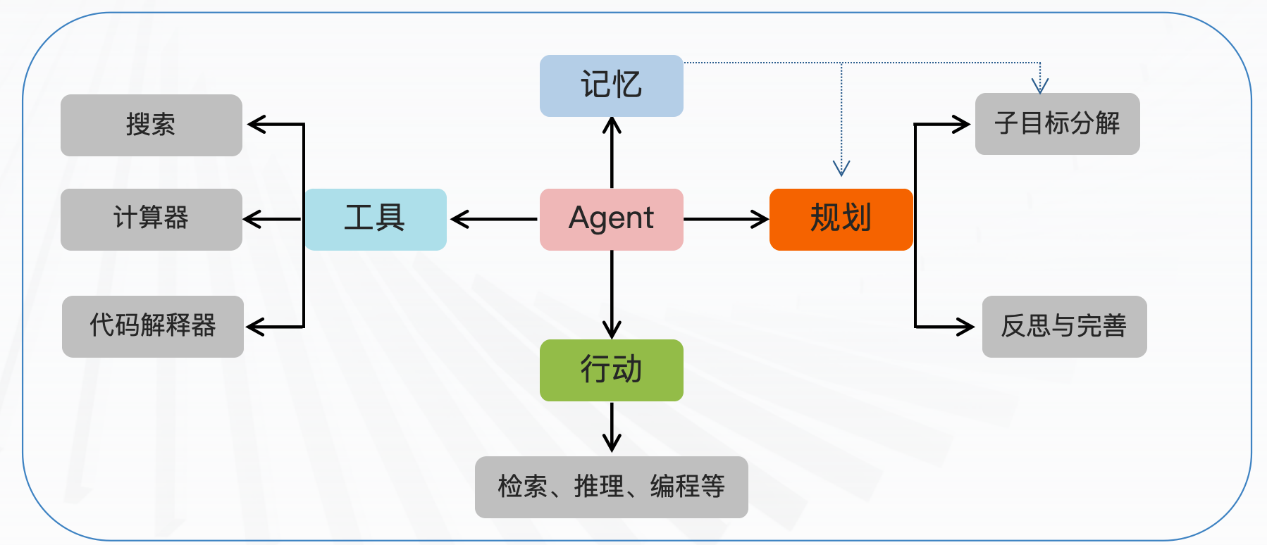 - 行动执行是Agent根据任务规划结果执行具体操作的过程。包含工具:计算器、代码解释器、搜索、API等