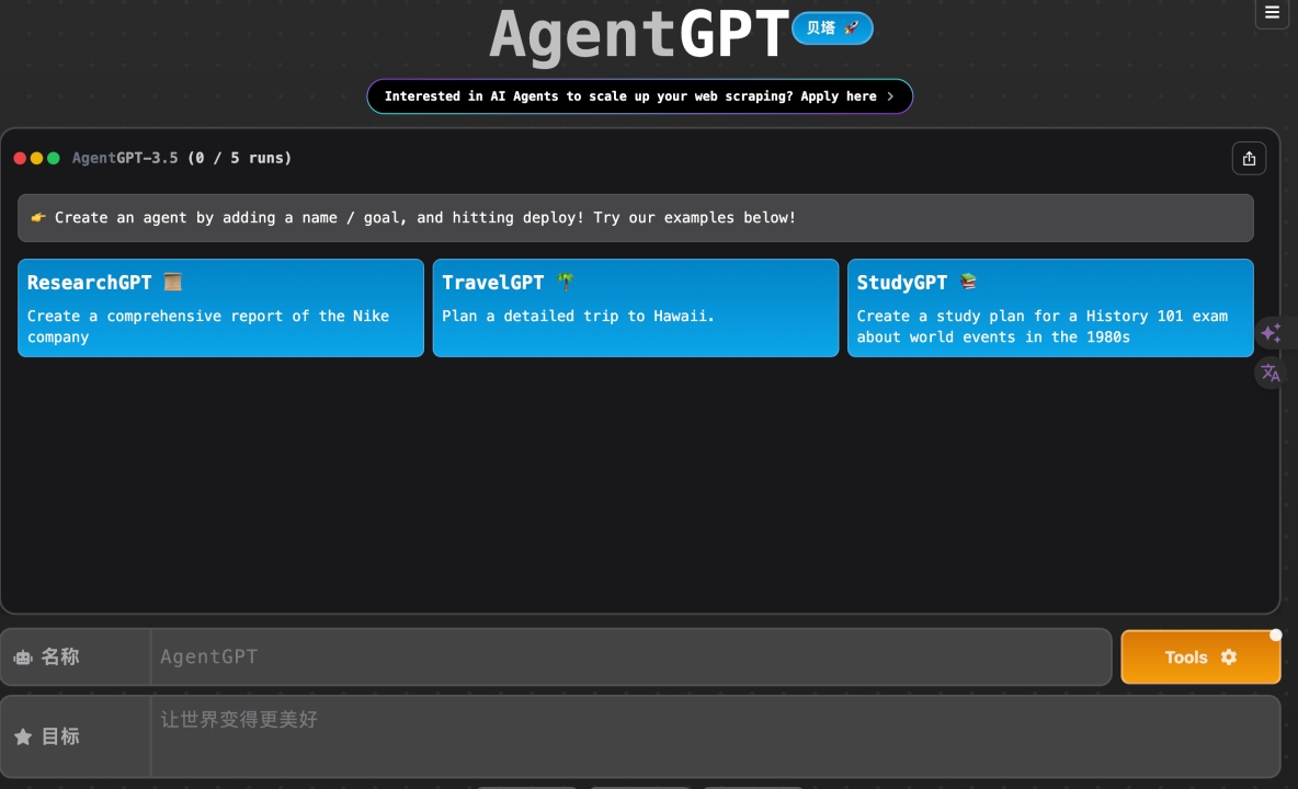 - 访问地址:https://agentgpt.reworkd.ai/zh